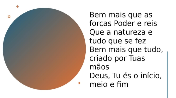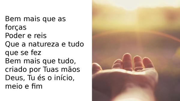 - Bem mais que as forçasPoder e reisQue a natureza e tudo que se fezBem mais que tudo, criado por Tuas mãosDeus, Tu és o início, meio e fim