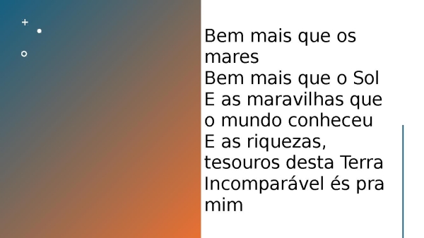 - Bem mais que os maresBem mais que o SolE as maravilhas que o mundo conheceu e as riquezas, tesouros desta Terra incomparável és pra mim