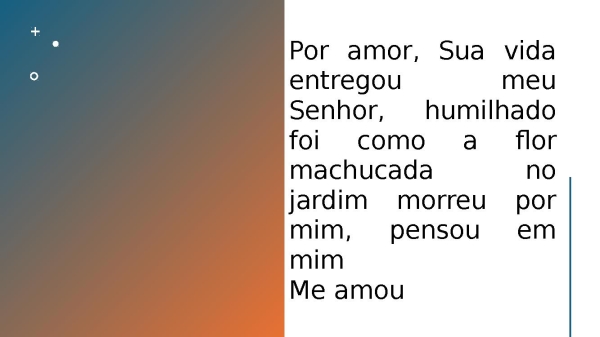 - Por amor, Sua vida entregouMeu Senhor, humilhado foiComo a flor machucada no jardimMorreu por mim, pensou em mimMe amou