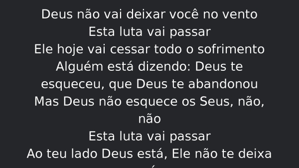 - Deus não vai deixar você no ventoEsta luta vai passarEle hoje vai cessar todo o sofrimentoAlguém está dizendo: Deus te esqueceu, que Deus te abandonouMas Deus não esquece os Seus, não, nãoEsta luta vai passarAo teu lado Deus está, Ele não te deixa só