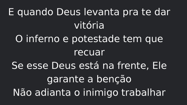 - E quando Deus levanta pra te dar vitóriaO inferno e potestade tem que recuarSe esse Deus está na frente, Ele garante a bençãoNão adianta o inimigo trabalhar