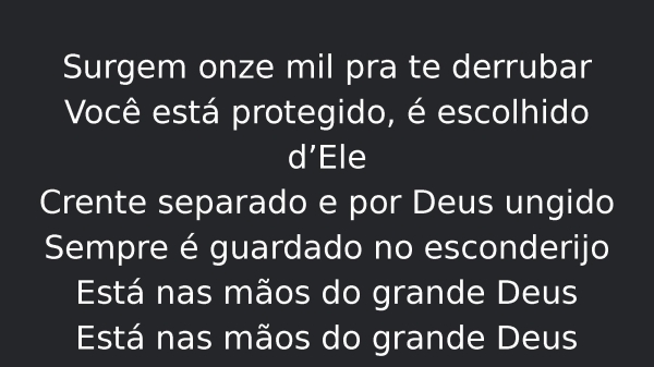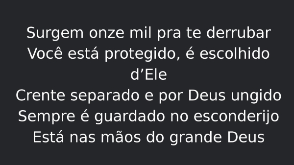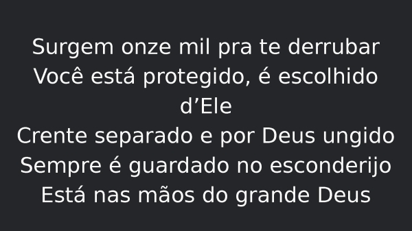 - Surgem onze mil pra te derrubarVocê está protegido, é escolhido d’EleCrente separado e por Deus ungidoSempre é guardado no esconderijoEstá nas mãos do grande Deus