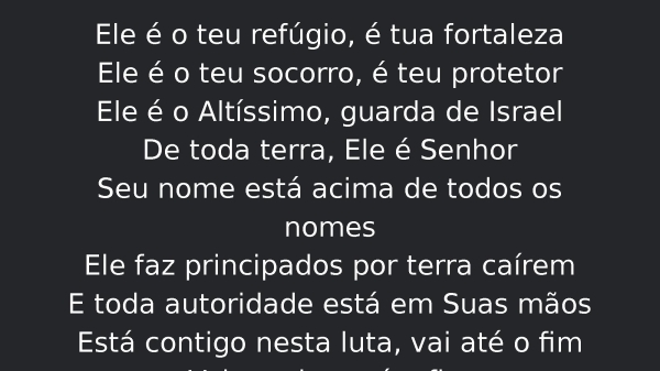 - Ele é o teu refúgio, é tua fortalezaEle é o teu socorro, é teu protetorEle é o Altíssimo, guarda de IsraelDe toda terra, Ele é SenhorSeu nome está acima de todos os nomesEle faz principados por terra caíremE toda autoridade está em Suas mãosEstá contigo nesta luta, vai até o fimVai contigo até o fim