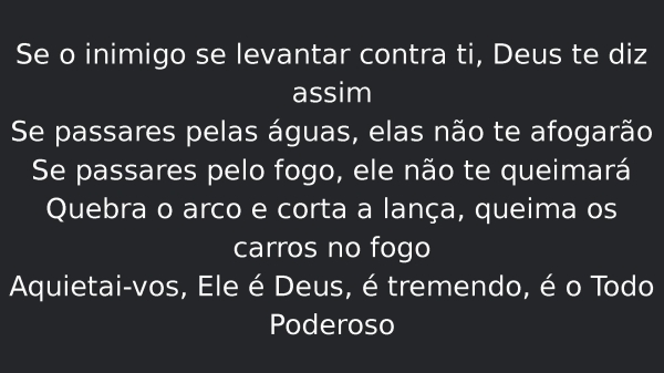 - Se o inimigo se levantar contra ti, Deus te diz assimSe passares pelas águas, elas não te afogarãoSe passares pelo fogo, ele não te queimaráQuebra o arco e corta a lança, queima os carros no fogoAquietai-vos, Ele é Deus, é tremendo, é o Todo Poderoso