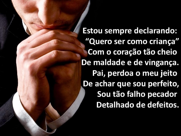 - Estou sempre declarando: “Quero ser como criança”Com o coração tão cheio De maldade e de vingança.Pai, perdoa o meu jeito De achar que sou perfeito,Sou tão falho pecador Detalhado de defeitos.