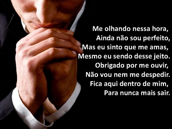 - Me olhando nessa hora, Ainda não sou perfeito,Mas eu sinto que me amas, Mesmo eu sendo desse jeito.Obrigado por me ouvir, Não vou nem me despedir.Fica aqui dentro de mim, Para nunca mais sair.