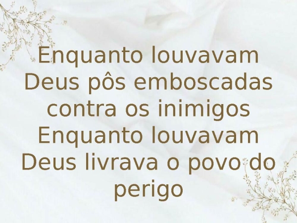 - Enquanto louvavamDeus pôs emboscadas contra os inimigosEnquanto louvavamDeus livrava o povo do perigo