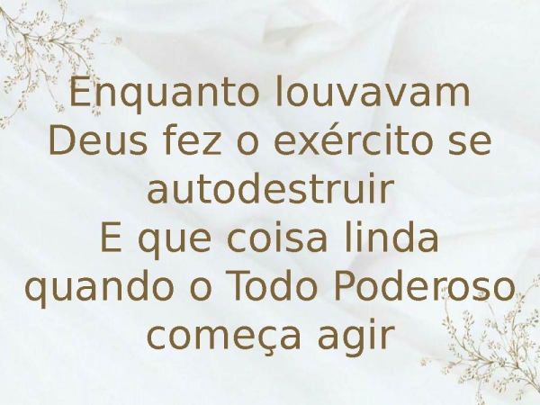 - Enquanto louvavamDeus fez o exército se autodestruirE que coisa linda quando o Todo Poderoso começa agir