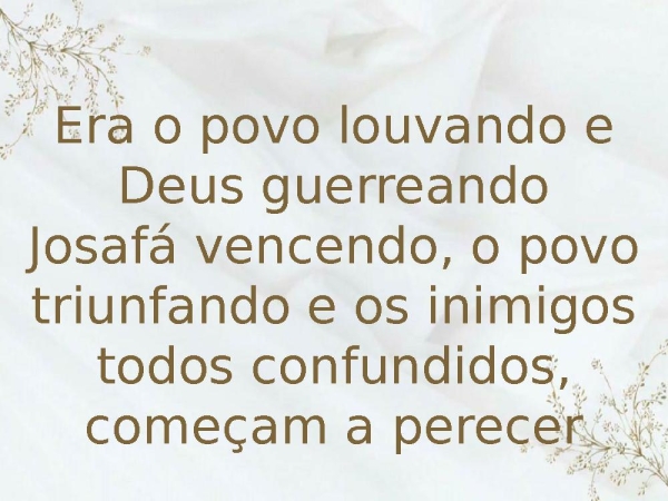 - Era o povo louvando e Deus guerreandoJosafá vencendo, o povo triunfando e os inimigos todos confundidos, começam a perecer