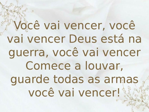 - Você vai vencer, você vai vencer Deus está na guerra, você vai vencerComece a louvar, guarde todas as armas você vai vencer!