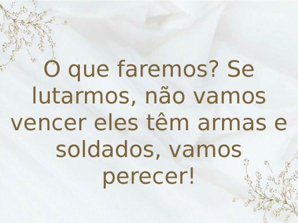 - O que faremos? Se lutarmos, não vamos vencer eles têm armas e soldados, vamos perecer!