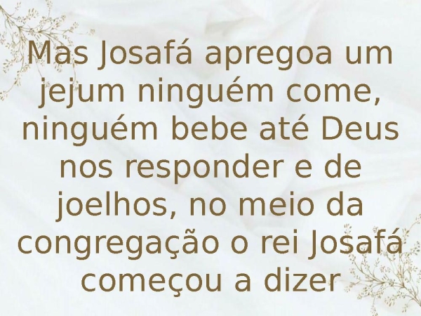 - Mas Josafá apregoa um jejum ninguém come, ninguém bebe até Deus nos responder e de joelhos, no meio da congregação o rei Josafá começou a dizer