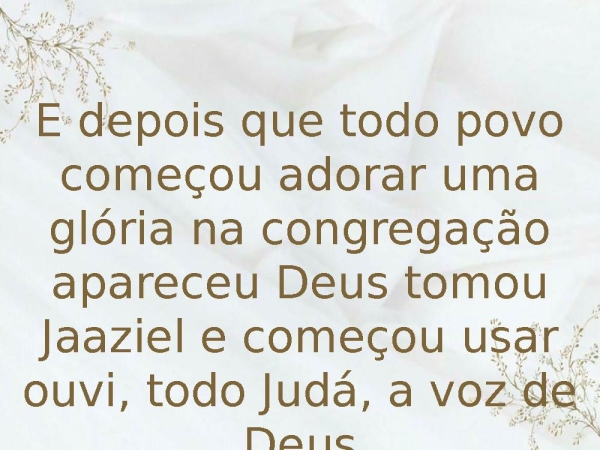 - E depois que todo povo começou adorar uma glória na congregação apareceu Deus tomou Jaaziel e começou usar ouvi, todo Judá, a voz de Deus