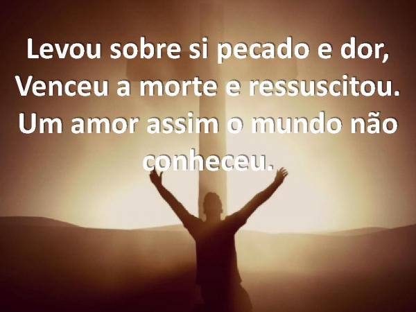 - Levou sobre si pecado e dor,Venceu a morte e ressuscitou.Um amor assim o mundo não conheceu.