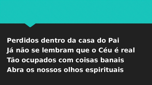 - Perdidos dentro da casa do PaiJá não se lembram que o Céu é realTão ocupados com coisas banaisAbra os nossos olhos espirituais