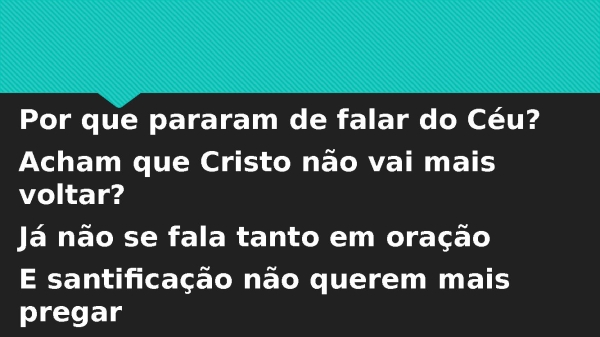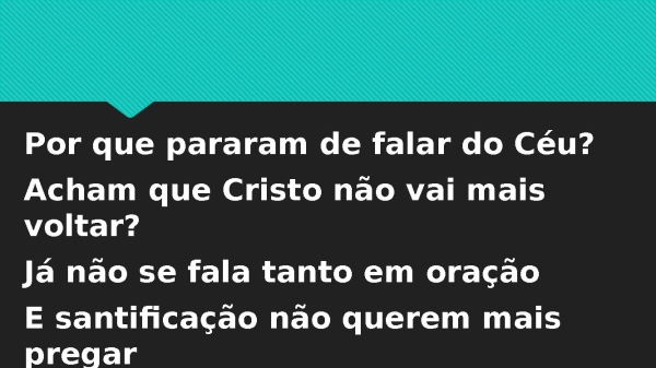 - Por que pararam de falar do Céu?Acham que Cristo não vai mais voltar?Já não se fala tanto em oraçãoE santificação não querem mais pregar