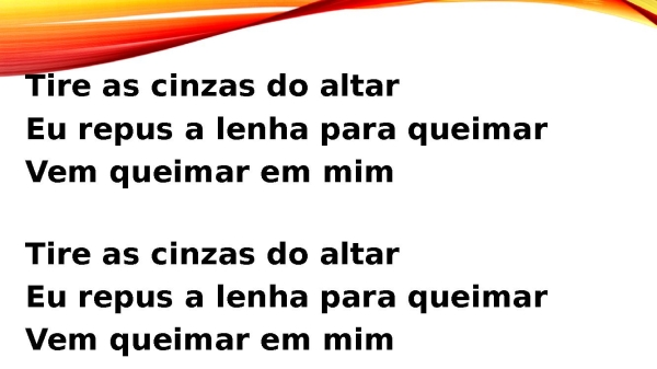 - Tire as cinzas do altarEu repus a lenha para queimarVem queimar em mimTire as cinzas do altarEu repus a lenha para queimarVem queimar em mim