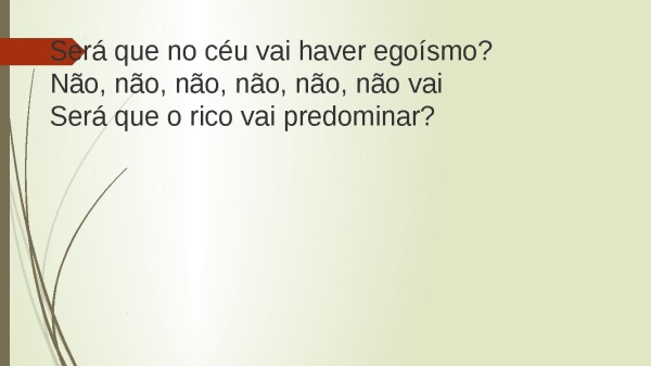 - Será que no céu vai haver egoísmo?Não, não, não, não, não, não vaiSerá que o rico vai predominar?