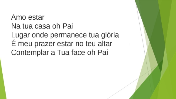 - Amo estarNa tua casa oh PaiLugar onde permanece tua glóriaÉ meu prazer estar no teu altarContemplar a Tua face oh Pai