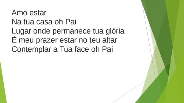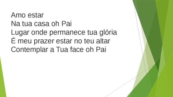 - Amo estarNa tua casa oh PaiLugar onde permanece tua glóriaÉ meu prazer estar no teu altarContemplar a Tua face oh Pai