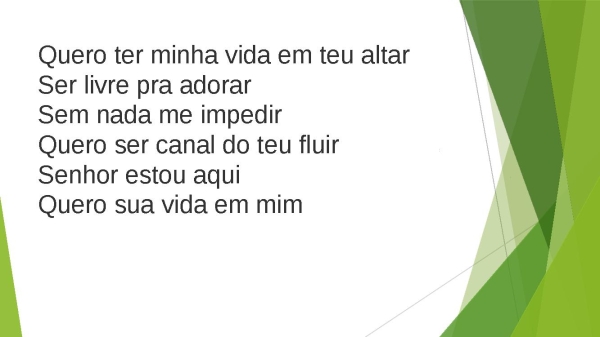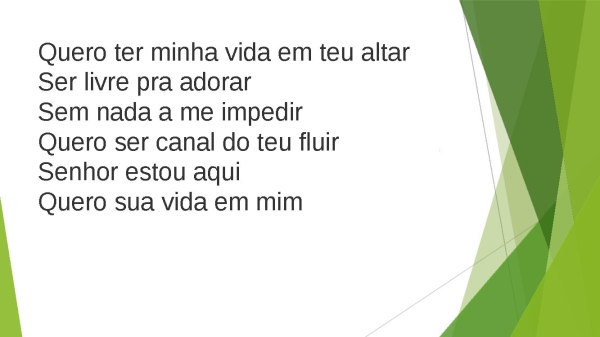 - Quero ter minha vida em teu altarSer livre pra adorarSem nada me impedirQuero ser canal do teu fluirSenhor estou aquiQuero sua vida em mim