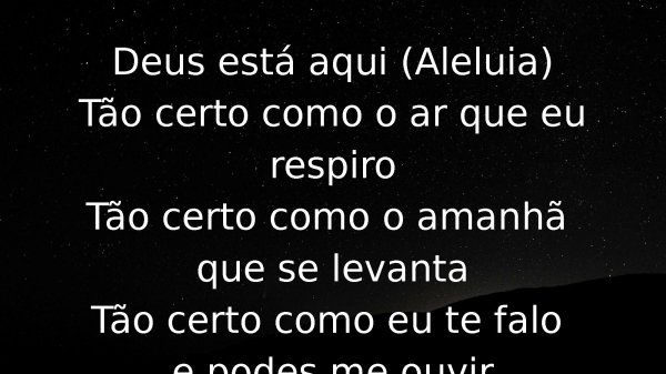 - Deus está aqui (Aleluia)Tão certo como o ar que eu respiroTão certo como o amanhã que se levantaTão certo como eu te falo e podes me ouvir
