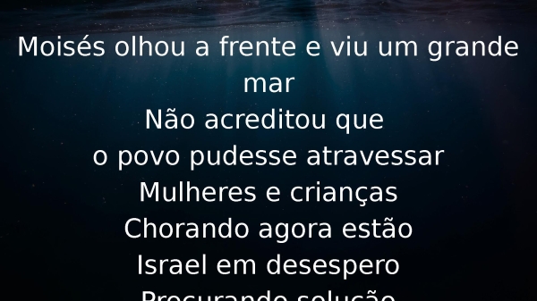 - Moisés olhou a frente e viu um grande marNão acreditou que o povo pudesse atravessarMulheres e criançasChorando agora estãoIsrael em desesperoProcurando solução