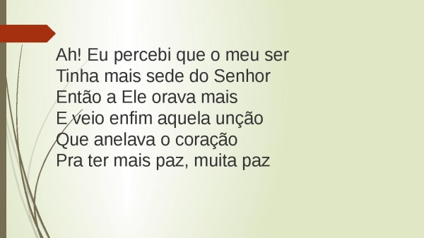 - Ah! Eu percebi que o meu serTinha mais sede do SenhorEntão a Ele orava maisE veio enfim aquela unçãoQue anelava o coraçãoPra ter mais paz, muita paz