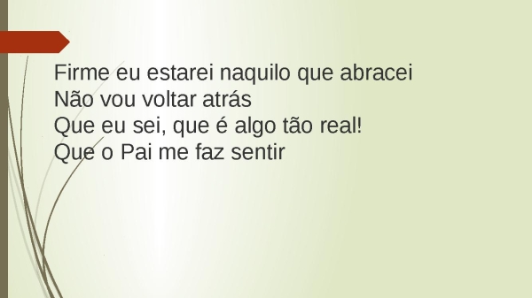 - Firme eu estarei naquilo que abraceiNão vou voltar atrásQue eu sei, que é algo tão real!Que o Pai me faz sentir