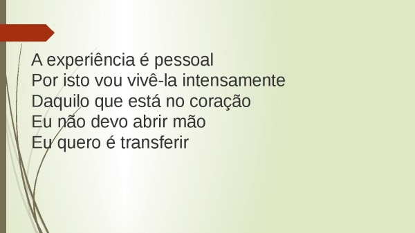 - A experiência é pessoalPor isto vou vivê-la intensamenteDaquilo que está no coraçãoEu não devo abrir mãoEu quero é transferir