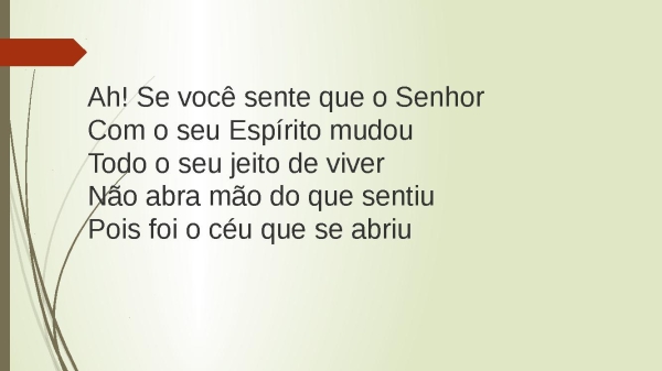 - Ah! Se você sente que o SenhorCom o seu Espírito mudouTodo o seu jeito de viverNão abra mão do que sentiuPois foi o céu que se abriu