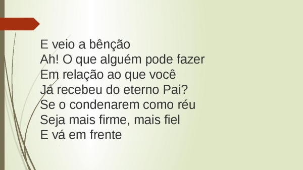 - E veio a bênçãoAh! O que alguém pode fazerEm relação ao que vocêJá recebeu do eterno Pai?Se o condenarem como réuSeja mais firme, mais fielE vá em frente