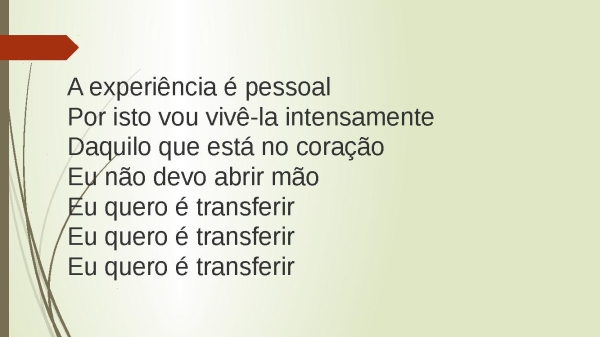 - A experiência é pessoalPor isto vou vivê-la intensamenteDaquilo que está no coraçãoEu não devo abrir mãoEu quero é transferirEu quero é transferirEu quero é transferir