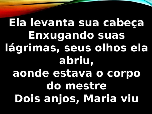 - Ela levanta sua cabeçaEnxugando suas lágrimas, seus olhos ela abriu,aonde estava o corpo do mestreDois anjos, Maria viu