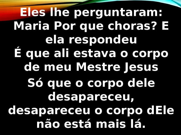 - Eles lhe perguntaram: Maria Por que choras? E ela respondeuÉ que ali estava o corpo de meu Mestre JesusSó que o corpo dele desapareceu, desapareceu o corpo dEle não está mais lá.