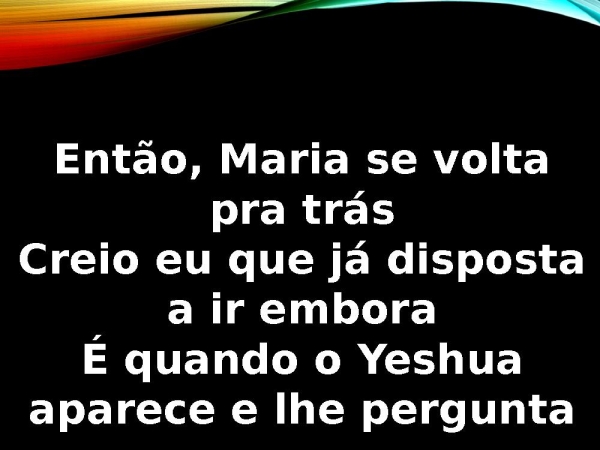 - Então, Maria se volta pra trásCreio eu que já disposta a ir emboraÉ quando o Yeshua aparece e lhe pergunta