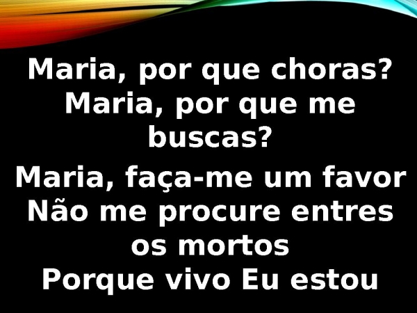 - Maria, por que choras?Maria, por que me buscas?Maria, faça-me um favorNão me procure entres os mortosPorque vivo Eu estou