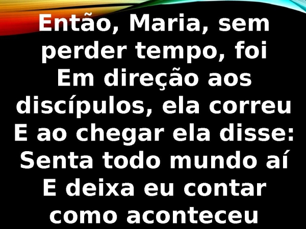 - Então, Maria, sem perder tempo, foiEm direção aos discípulos, ela correuE ao chegar ela disse: Senta todo mundo aíE deixa eu contar como aconteceu