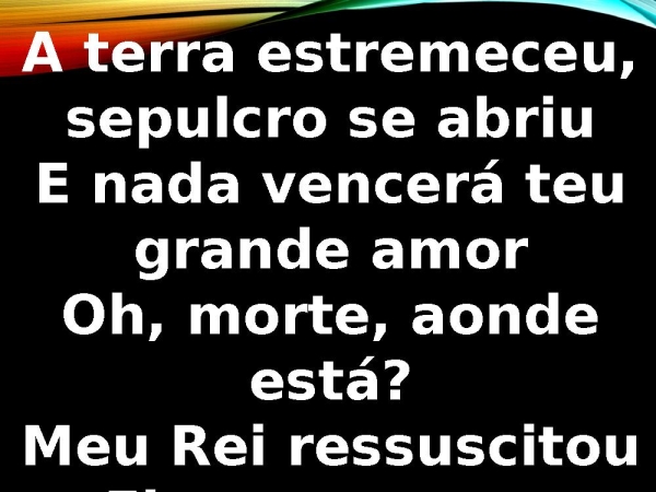 - A terra estremeceu, sepulcro se abriuE nada vencerá teu grande amorOh, morte, aonde está?Meu Rei ressuscitouEle venceu pra sempre