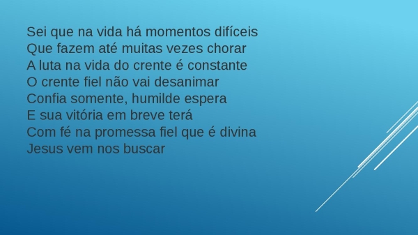 - Sei que na vida há momentos difíceisQue fazem até muitas vezes chorarA luta na vida do crente é constanteO crente fiel não vai desanimarConfia somente, humilde esperaE sua vitória em breve teráCom fé na promessa fiel que é divinaJesus vem nos buscar