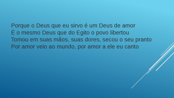 - Porque o Deus que eu sirvo é um Deus de amorÉ o mesmo Deus que do Egito o povo libertouTomou em suas mãos, suas dores, secou o seu prantoPor amor veio ao mundo, por amor a ele eu canto