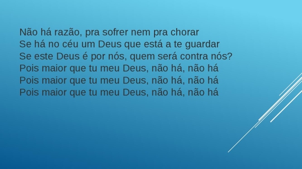 - Não há razão, pra sofrer nem pra chorarSe há no céu um Deus que está a te guardarSe este Deus é por nós, quem será contra nós?Pois maior que tu meu Deus, não há, não háPois maior que tu meu Deus, não há, não háPois maior que tu meu Deus, não há, não há