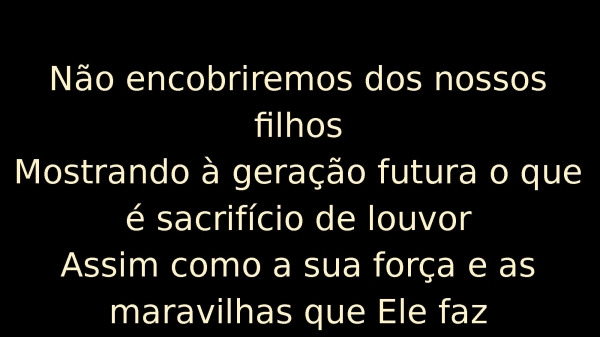 - Não encobriremos dos nossos filhosMostrando à geração futura o que é sacrifício de louvorAssim como a sua força e as maravilhas que Ele faz