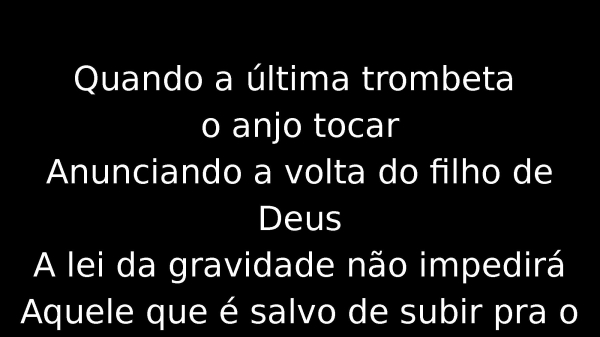 - Quando a última trombeta o anjo tocarAnunciando a volta do filho de DeusA lei da gravidade não impediráAquele que é salvo de subir pra o céu