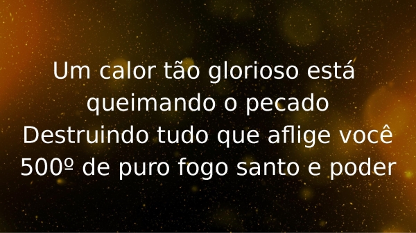 - Um calor tão glorioso está queimando o pecadoDestruindo tudo que aflige você500º de puro fogo santo e poder