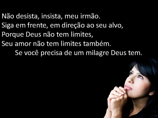 - Não desista, insista, meu irmão. Siga em frente, em direção ao seu alvo, Porque Deus não tem limites, Seu amor não tem limites também. Se você precisa de um milagre Deus tem.
