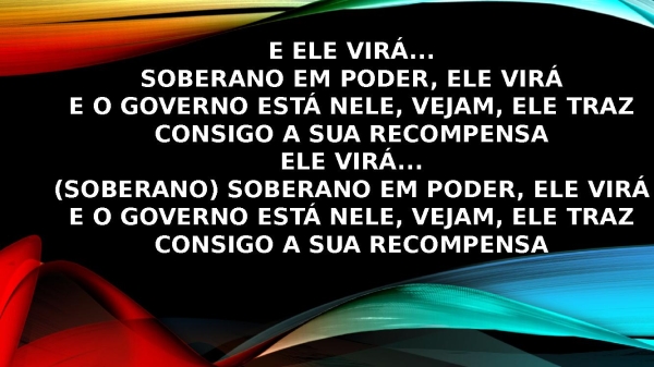 - E Ele virá...Soberano em poder, Ele viráE o governo está Nele, vejam, Ele trazConsigo a sua recompensaEle virá...(Soberano) soberano em poder, Ele viráE o governo está Nele, vejam, Ele trazConsigo a sua recompensa