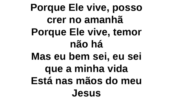 - Porque Ele vive, posso crer no amanhã Porque Ele vive, temor não háMas eu bem sei, eu sei que a minha vidaEstá nas mãos do meu JesusQue vivo está