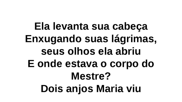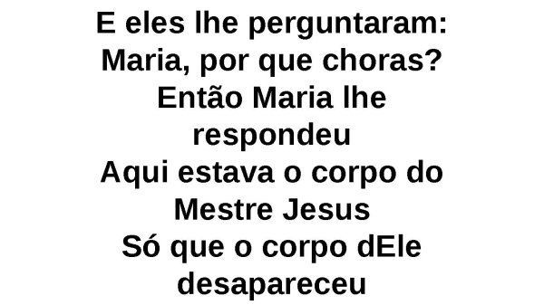 - E eles lhe perguntaram: Maria, por que choras?Então Maria lhe respondeuAqui estava o corpo do Mestre JesusSó que o corpo dEle desapareceuDesapareceu