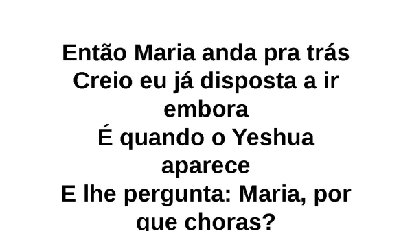 - Então Maria anda pra trásCreio eu já disposta a ir emboraÉ quando o Yeshua apareceE lhe pergunta: Maria, por que choras?